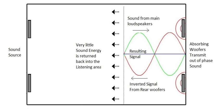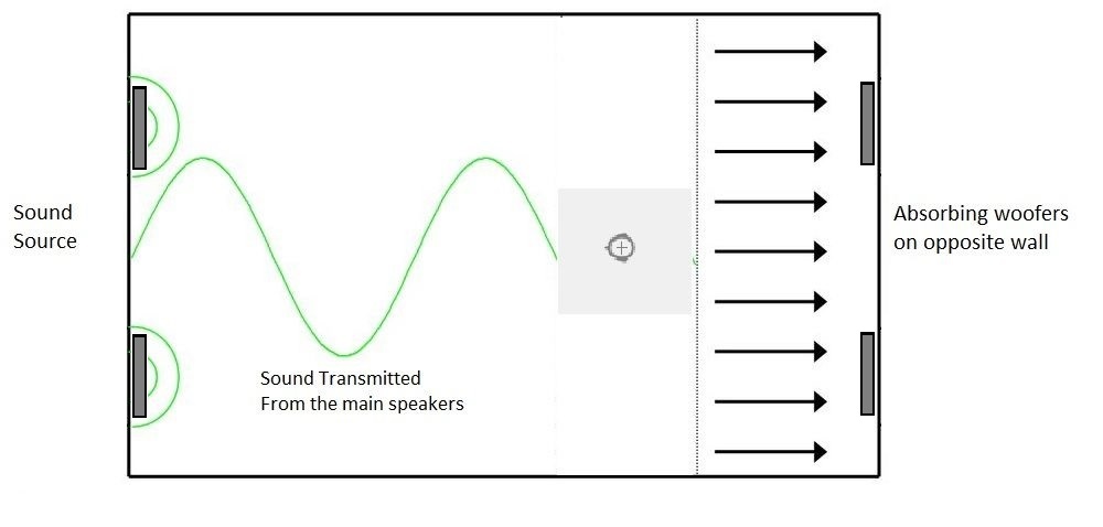 Shown below, the woofers are positioned to create a low frequency waveguide (also known as a double bass array). Here the sound travels from left to right, low frequencies travel down the room and are absorbed at the opposite end. There is an amazing improvement in both dips and peaks in the rooms low frequency response and control over decay rate with this approach.