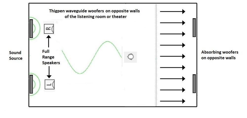 Conventional home loudspeakers or subwoofers placed near side or rear walls create reflections, these long wavelength low frequency reflections, depending on frequency, sum with the source and cause numerous peaks and dips in the frequency response experienced by the listener. While peaks can be corrected with DSP, severe dips, cannot be corrected. The Thigpen woofer's large sound source and thin form factor allow you to have multiple woofers in any sized room and turn the room into waveguide.
