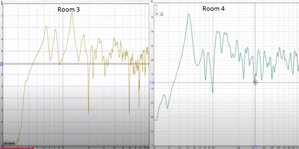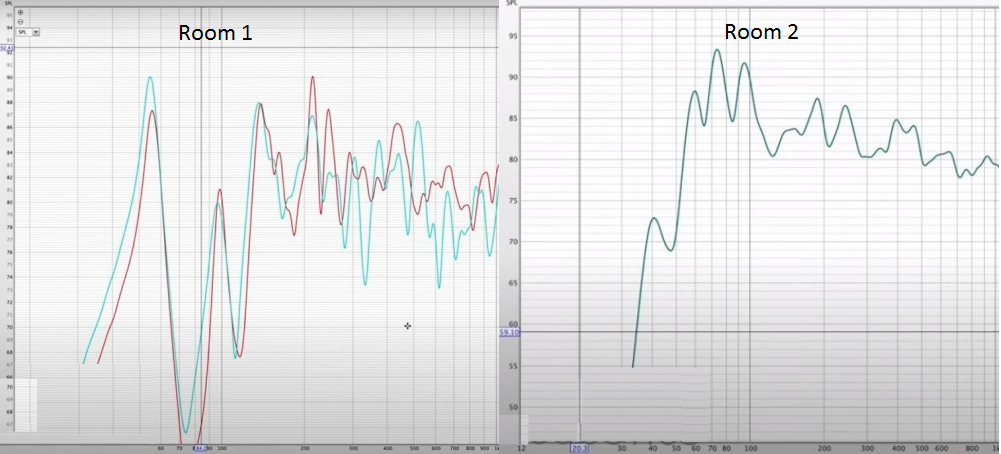However, once placed in a room, the response starts to look like these graphs below. The upper left graph shows before and after adding bass